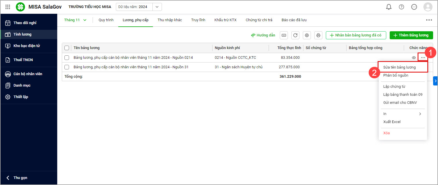 3. Chương trình tự động thay đổi tên theo kỳ lương đã chọn, nội dung của các bảng lương sẽ không có gì thay đổi4. Để sửa tên bảng lương nếu có nhu cầu, anh/chị chọn biểu tượng … và chọn Sửa tên bảng lương
