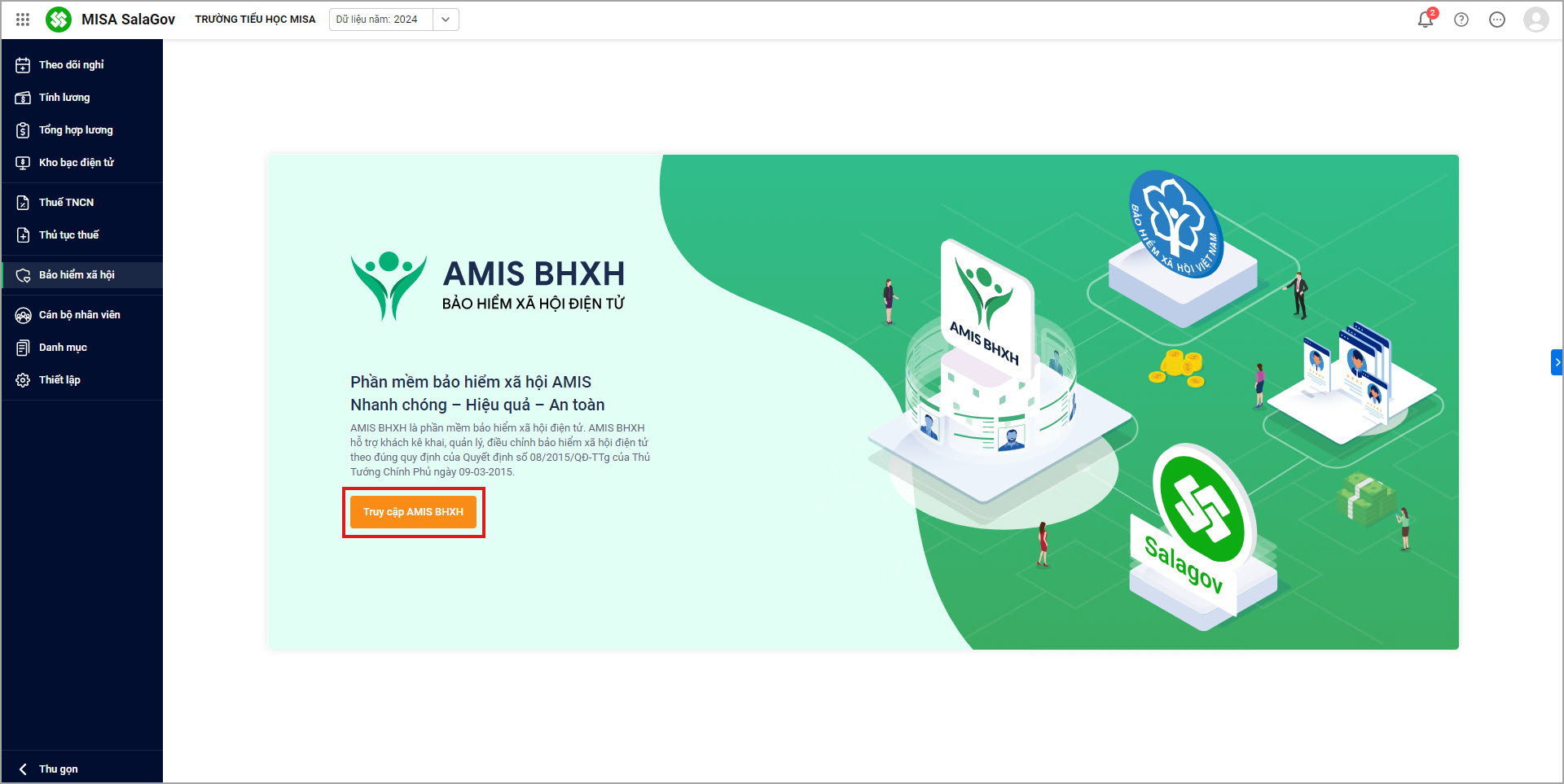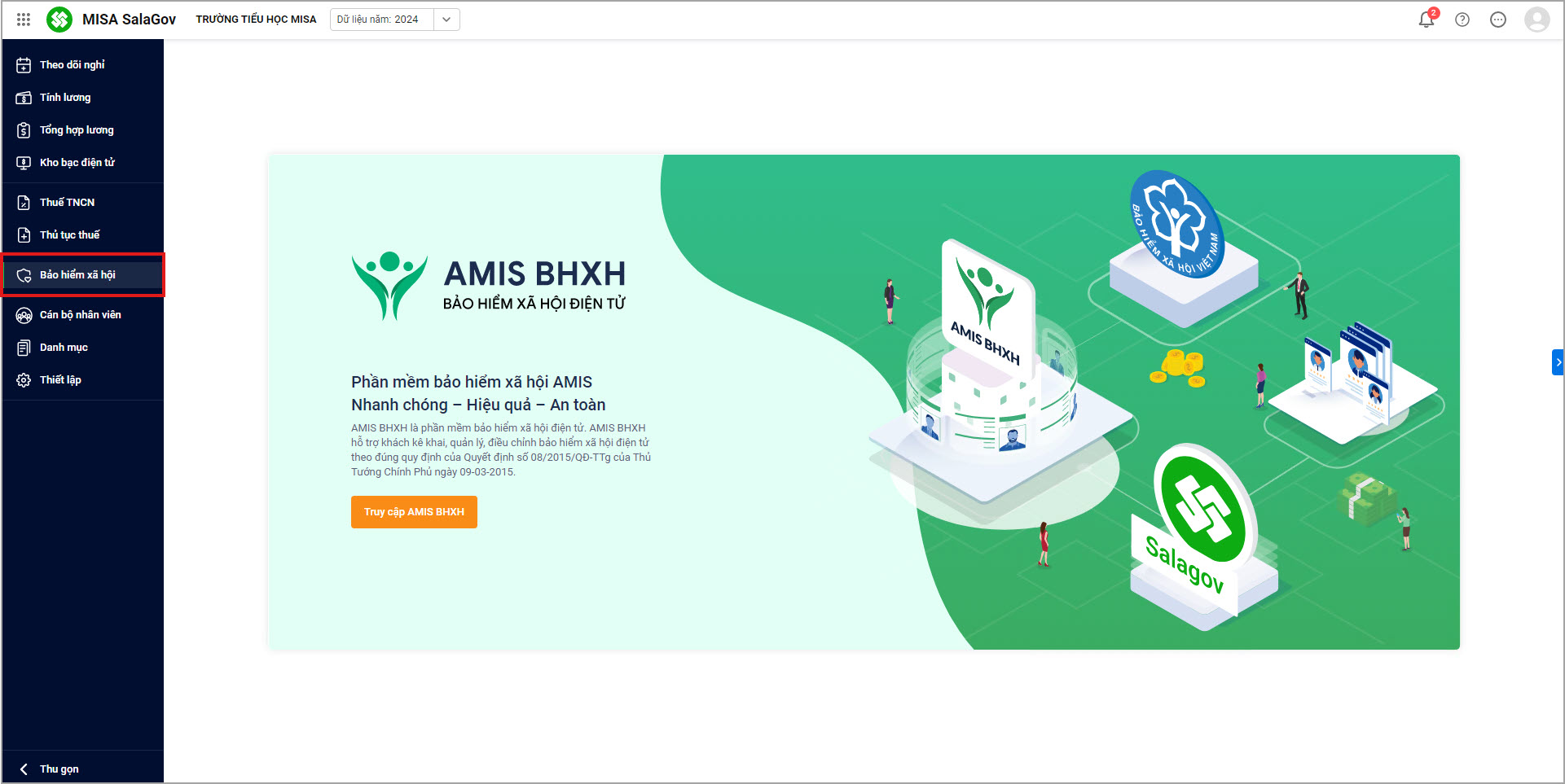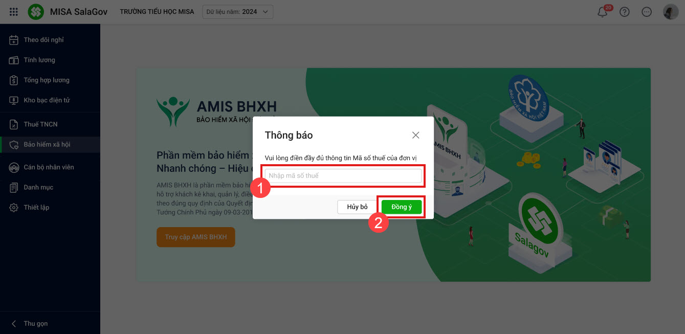 1. Vào menu Bảo hiểm xã hội 2. Chọn truy cập AMIS BHXH để chuyển sang phần mềm AMIS BHXHLưu ý: Nếu đơn vị chưa điền thông tin mã số thuế, phần mềm AMIS BHXH sẽ hiển thị thông báo yêu cầu nhập mã số thuế để tiếp tục sử dụng các chức năng của chương trình.3. Tại đơn vị sẽ có 2 trường hợp như sau: