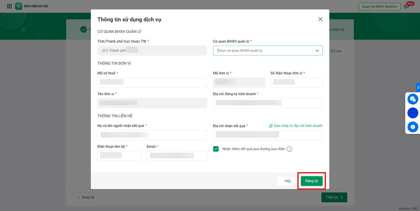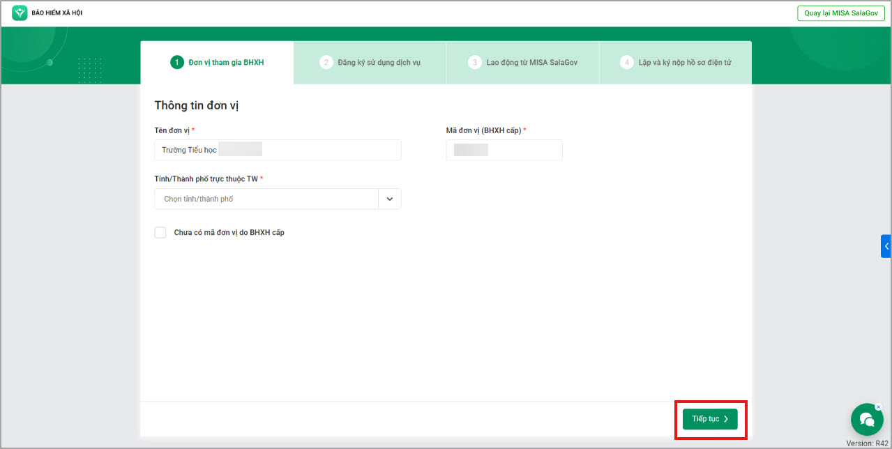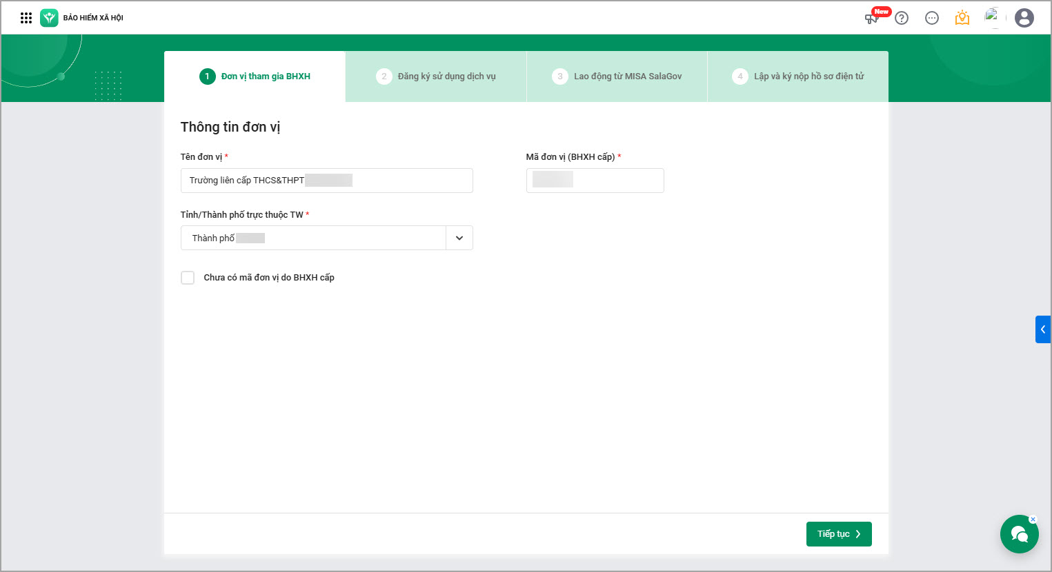 1. Anh/chị nhập đầy đủ thông tin đơn vị, chọn Tiếp tục 2. Đăng ký sử dụng dịch vụ