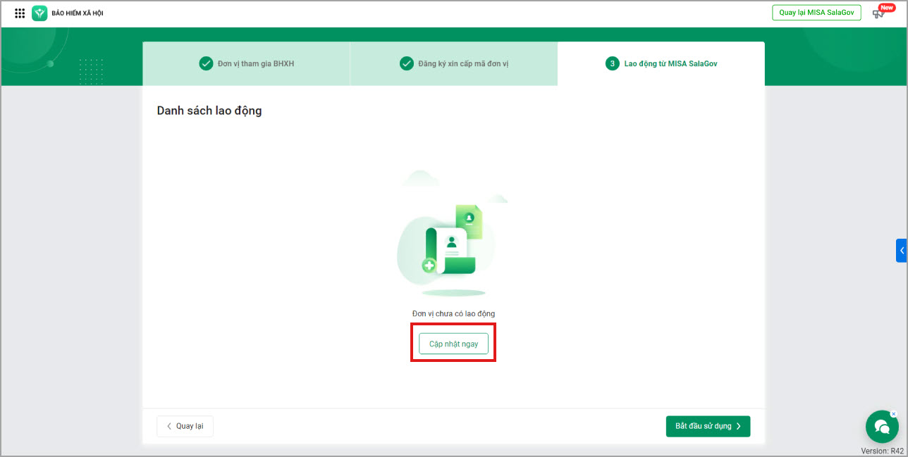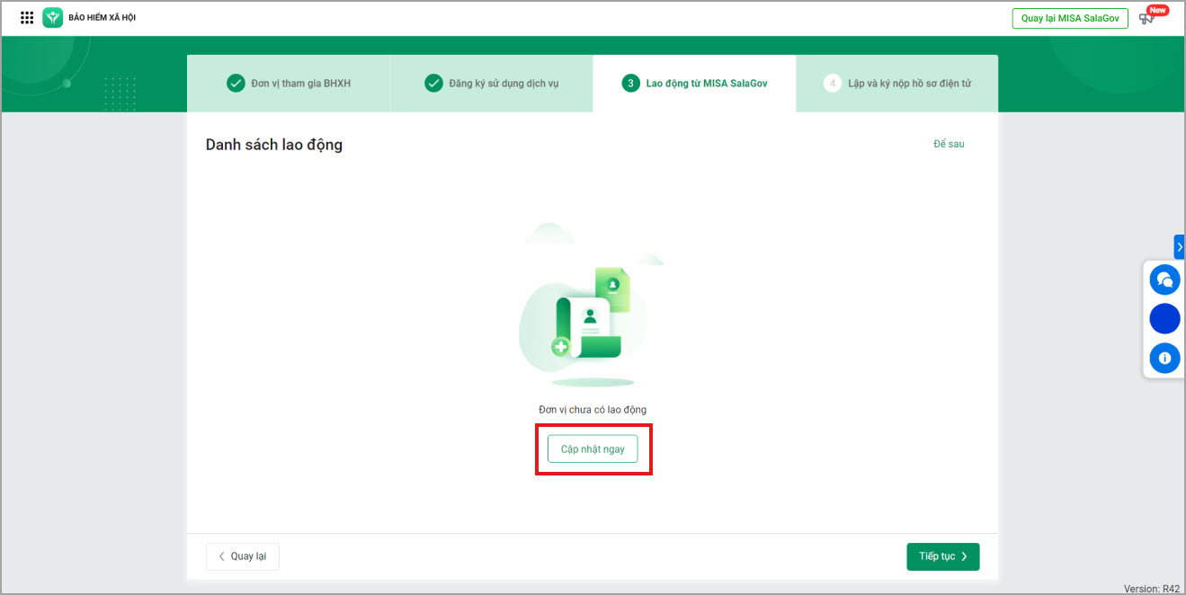 3. Sau khi đăng ký xong anh/chị chọn Tiếp tục 4. Chọn Cập nhật ngay để đồng bộ thông tin CBNV từ phần mềm MISA SalaGov vào ứng dụng BHXH mà không mất công phải nhập lại.