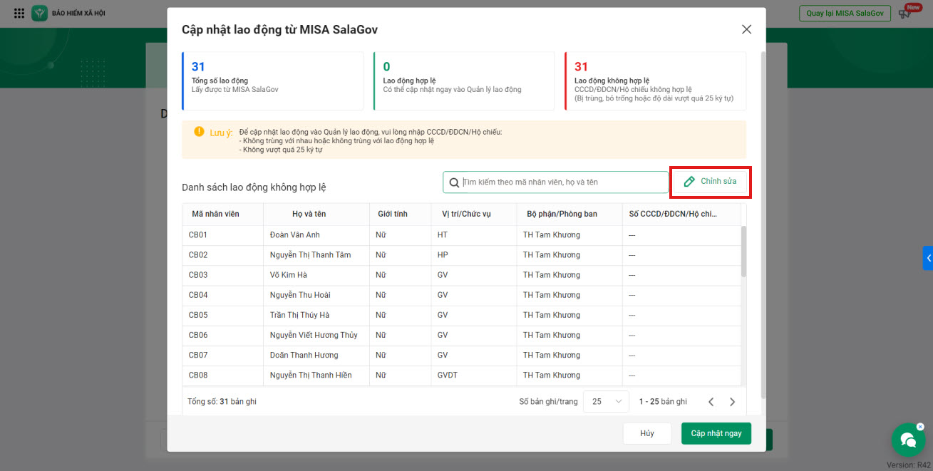• Tại màn hình cập nhật lao động từ MISA SalaGov, nếu có thông tin không hợp lệ (như là thiếu thông tin CCCD/CMND/Hộ chiếu), thì anh/chị nhấn Chỉnh sửa và thực hiện cập nhật.