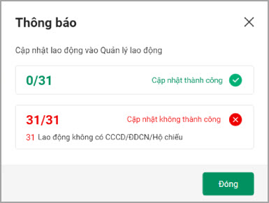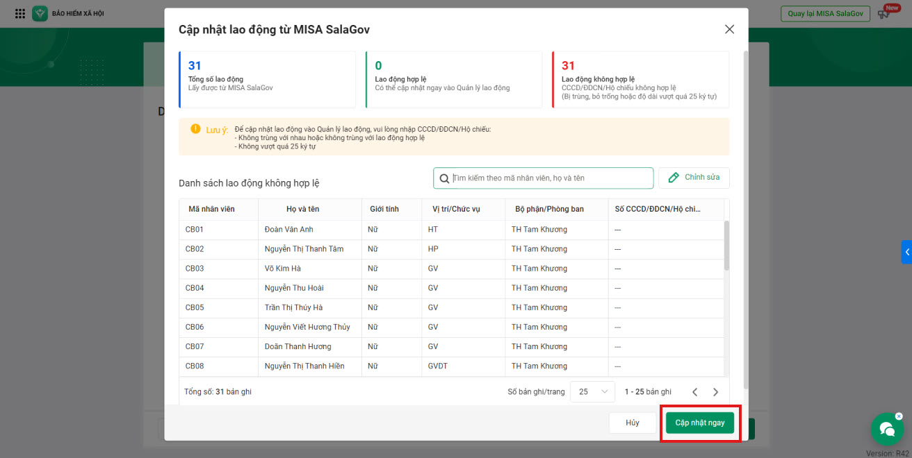 5. Chọn Cập nhật ngay khi đồng bộ thành công, chương trình sẽ hiển thị thông báo. Đồng thời thông tin CCCD/CMND/Hộ chiếu của CBNV cũng sẽ tự động được đồng bộ ngược lại từ ứng dụng BHXH sang Danh sách CBNV của phần mềm MISA SalaGov.