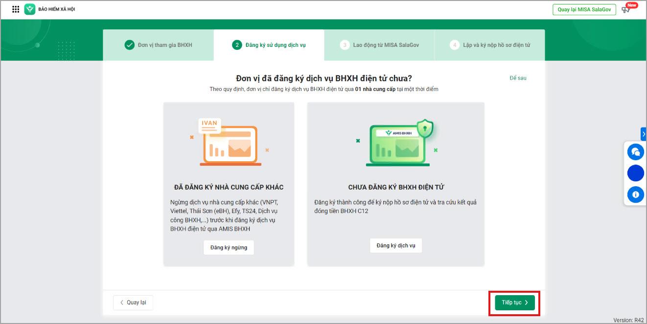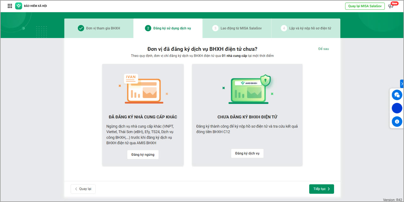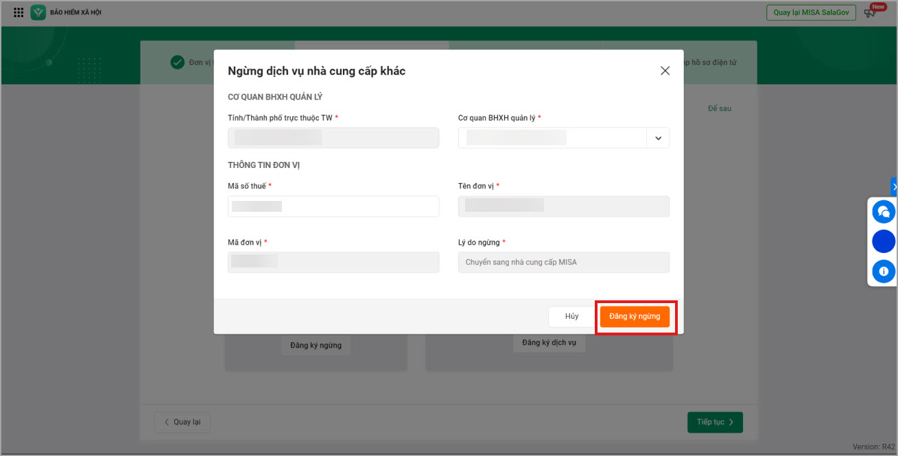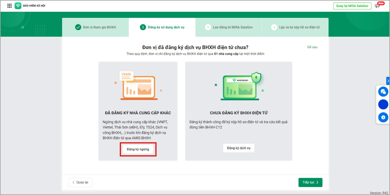 • Trường hợp trước đó đã đăng dịch vụ BHXH điện tử của nhà cung cấp khác, Anh/Chị cần thực hiện ngừng dịch vụ trước khi đăng ký sử dụng dịch vụ BHXH điện tử của MISA.