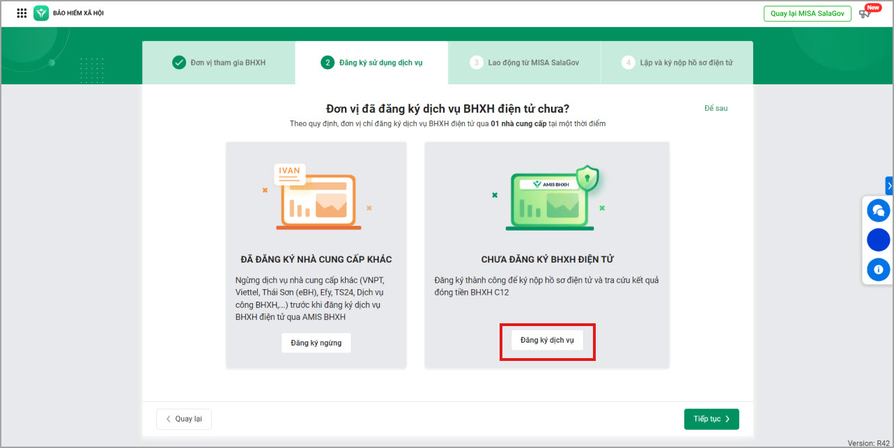 • Trường hợp trước đó chưa từng sử dụng dịch vụ BHXH của nhà cung cấp nào hoặc đã ngừng thành công, anh/chị nhấn Đăng ký dịch vụ. Khai báo thông tin sử dụng dịch vụ sau đó ký nộp hồ sơ sang cơ quan BHXH.