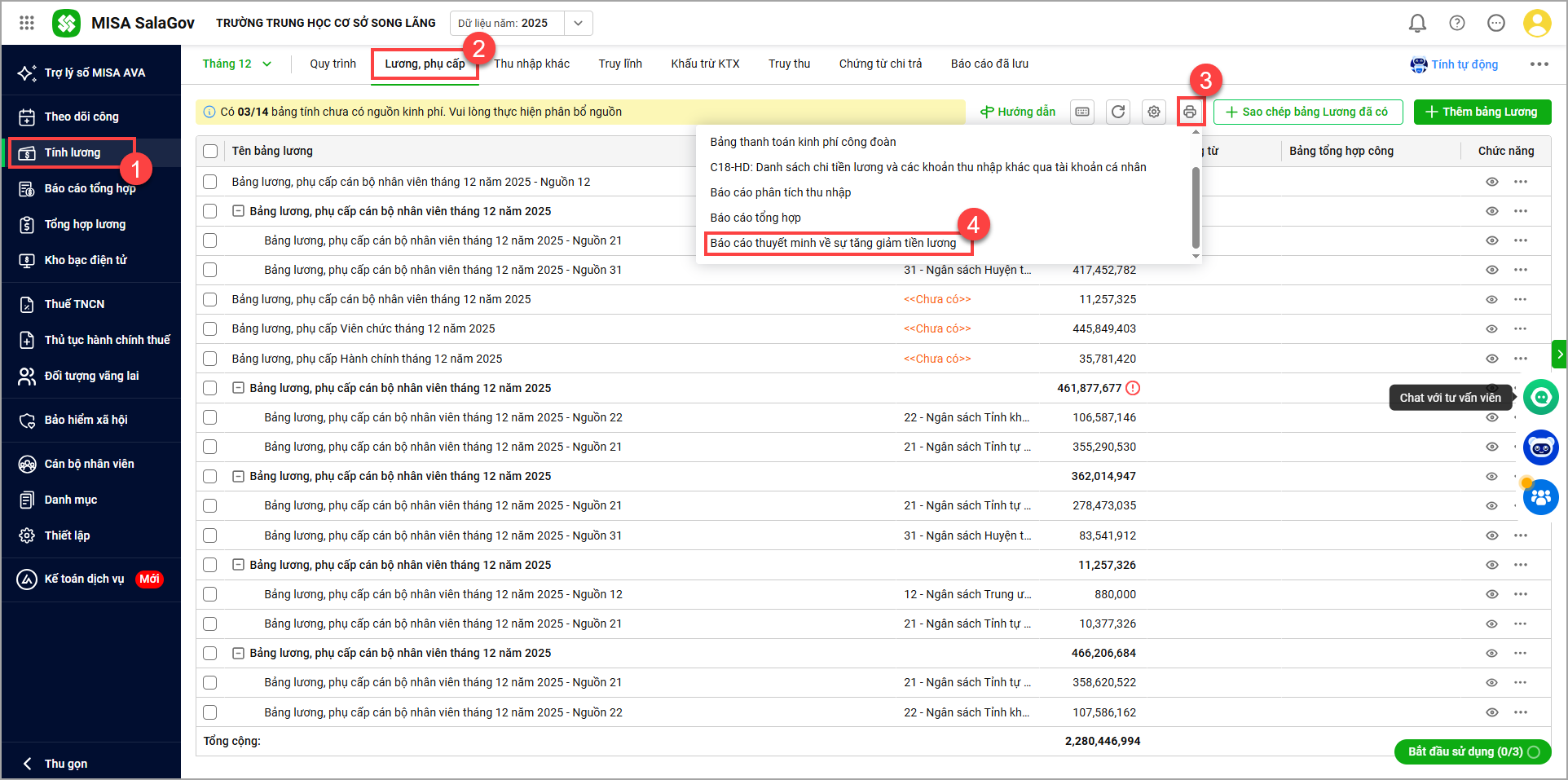 - Vào Tiền lương/Lương phụ cấp. Nhấn vào biểu tượng máy in sau đó chọn Báo cáo thuyết minh về sự tăng/giảm tiền lương