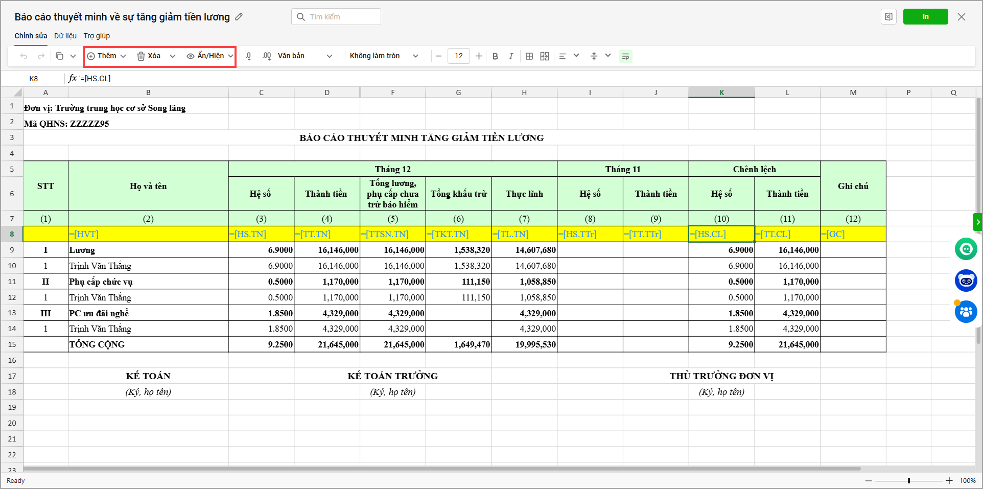 - Bấm Ẩn/hiện để ẩn hoặc hiện các dòng chi tiết trong báo cáo
