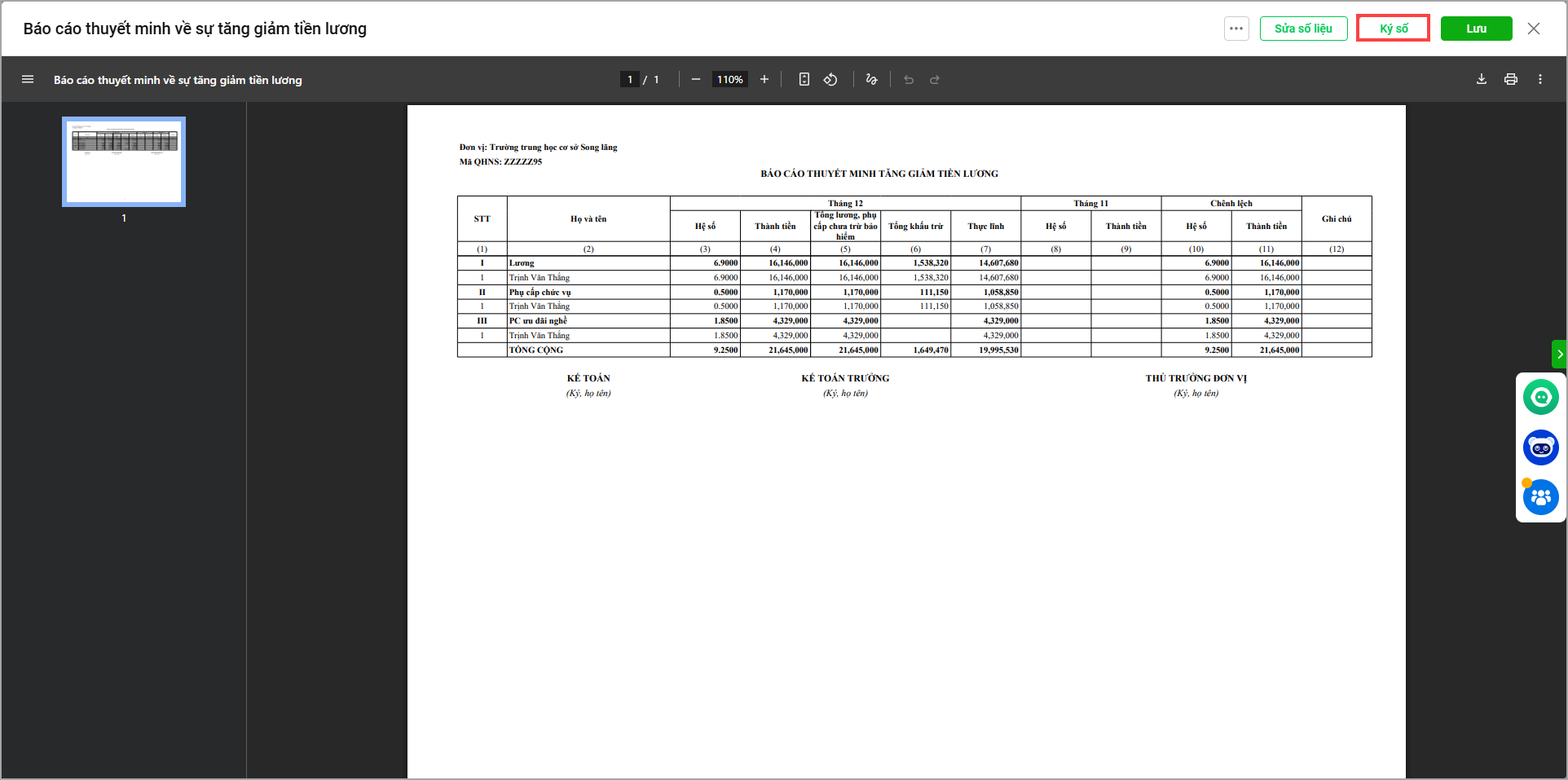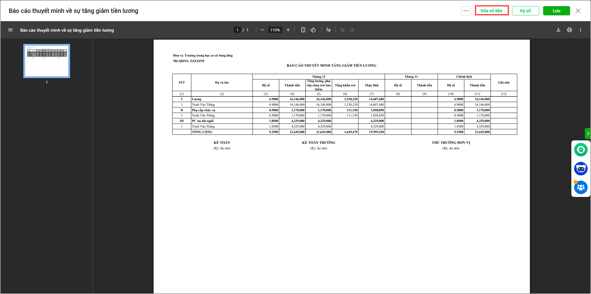 4. Nhấn Sửa số liệu để cập nhật lại số liệu trong báo cáo