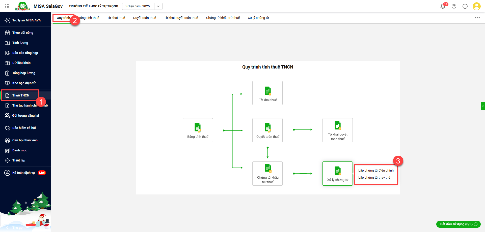 Vào Thuế TNCN/Quy trình, phần mềm bổ sung thêm các bước xử lý chứng từ gồm: Lập chứng từ điều chỉnh/ Lập chứng từ thay thế