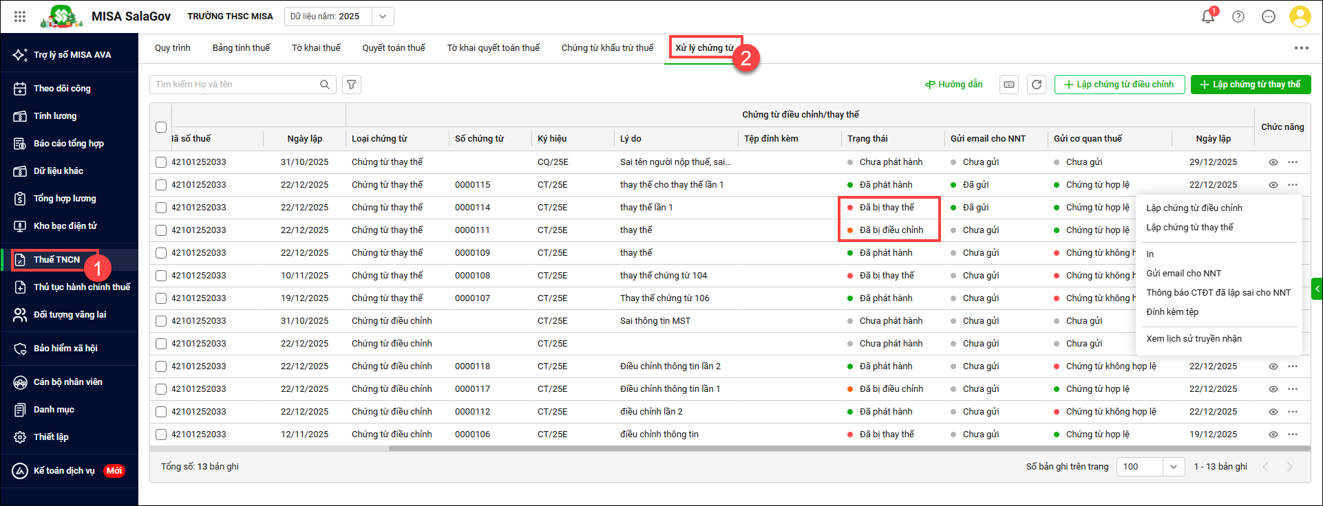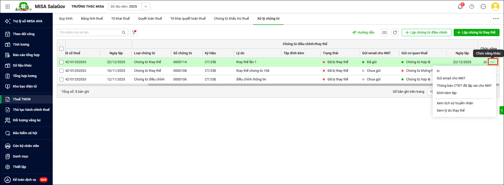 Bài viết hướng dẫn kế toán lập chứng từ khấu trừ thuế điều chỉnh, thay thế khi có sai sót theo Nghị định 70/2025/NĐ-CP. Nội dung tổng quan gồm: Xem Quy trình thuế TNCN; Lập chứng từ điều chỉnh/chứng từ thay thế; Quản lý các chứng từ điều chỉnh, chứng từ thay thế; Gửi email cho NNT