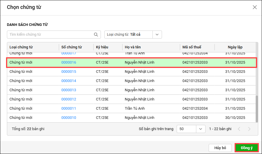 Tích chọn chứng từ sau đó nhấn Đồng ý