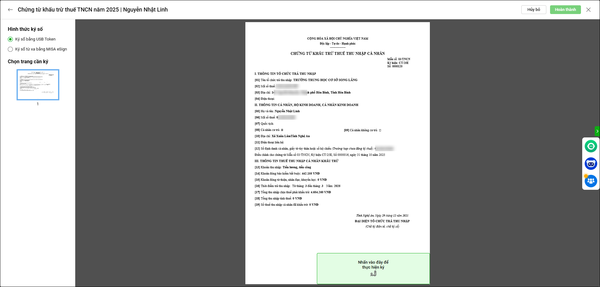 6. Anh/chị thực hiện ký số theo hướng dẫn sau đó nhấn Hoàn thành.