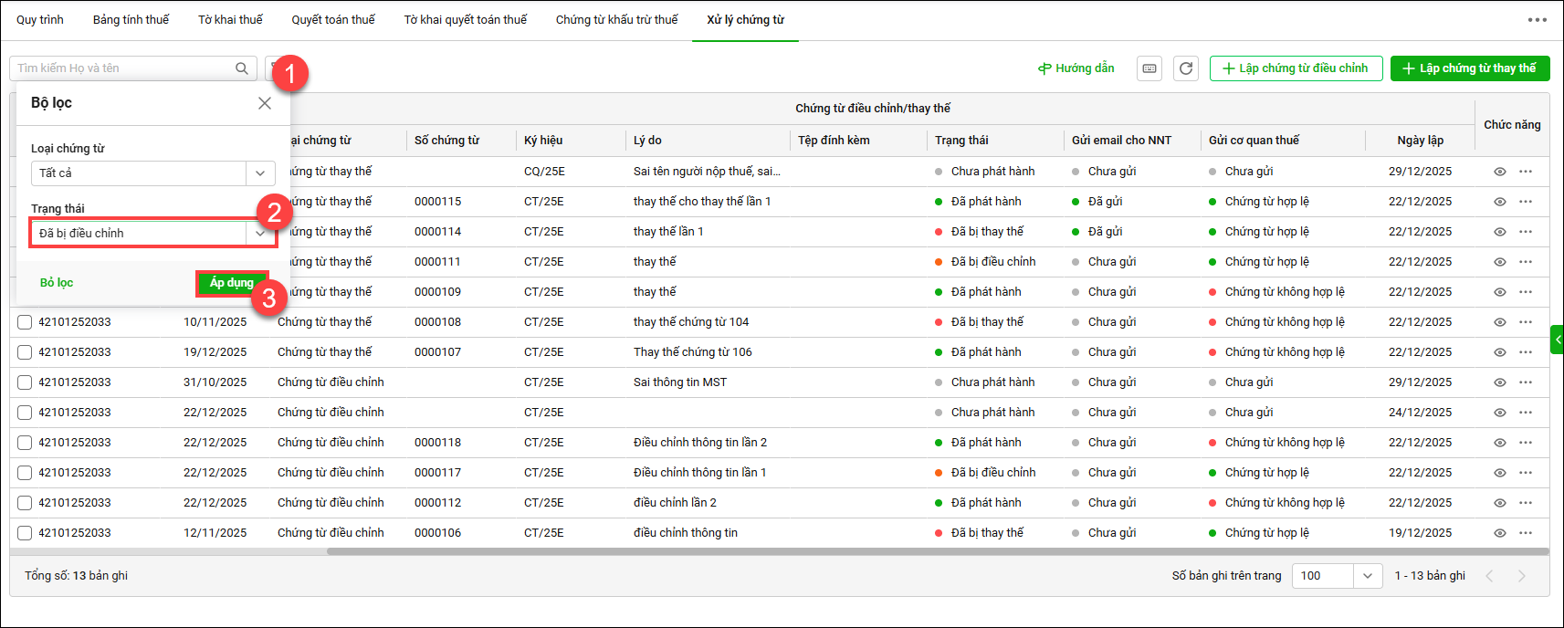 - Anh/chị có thể lọc nhanh các chứng từ đã bị điều chỉnh/thay thế bằng cách nhấn vào bộ lọc sau đó chọn Trạng thái và bấm Áp dụng