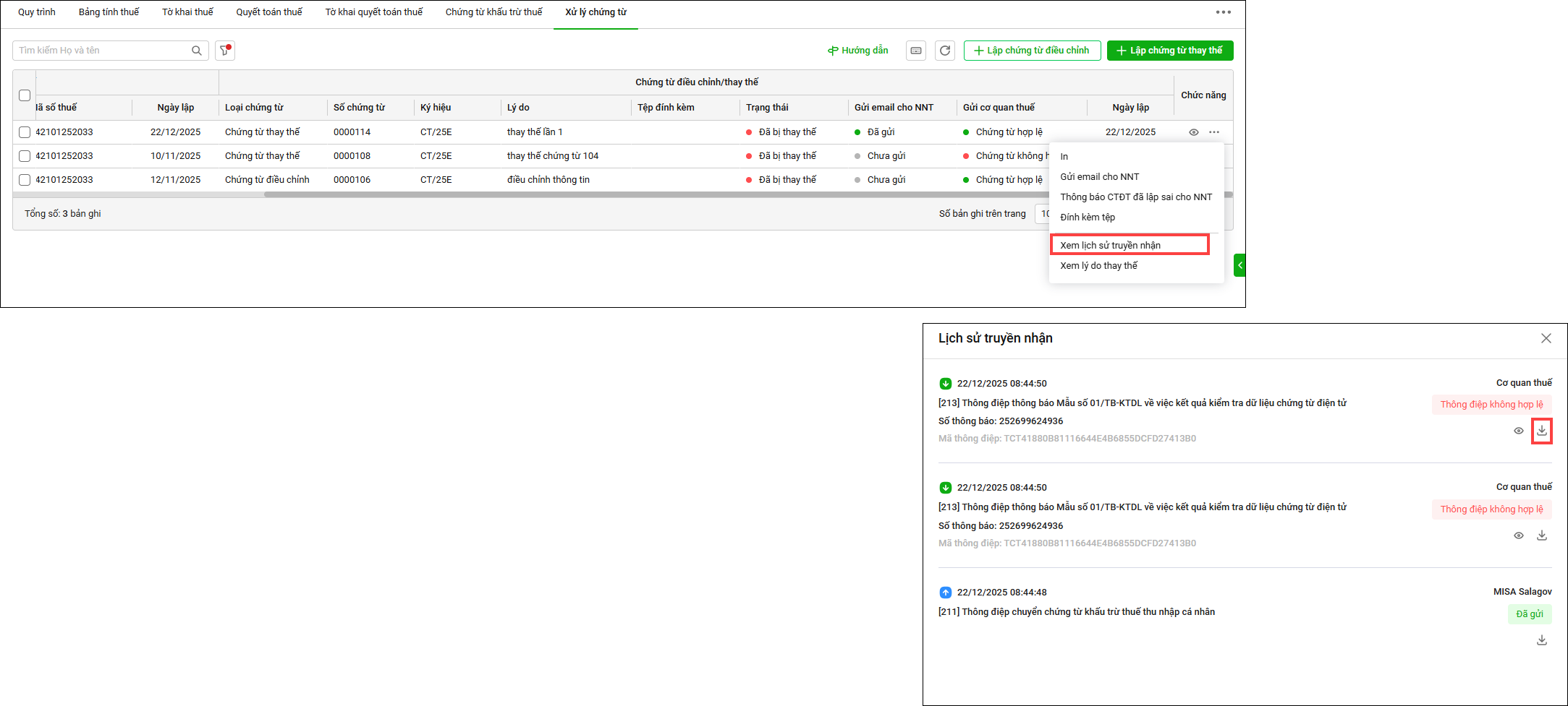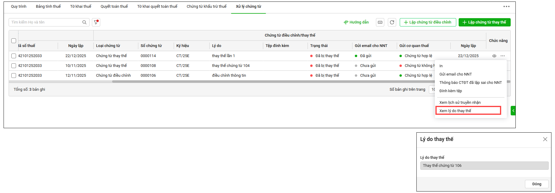 Quản lý chứng từ điều chỉnh/chứng từ thay thế