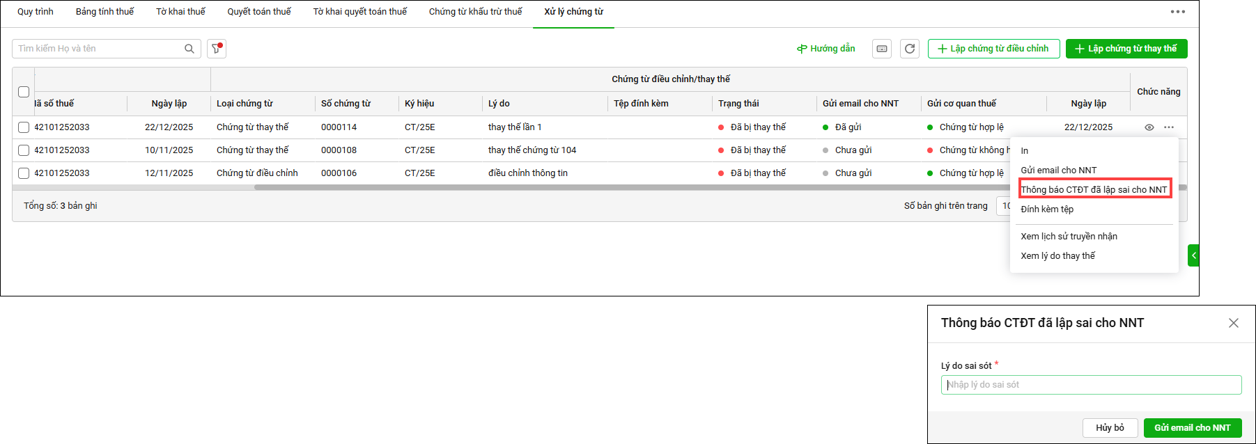 - Nhấn Thông báo CTĐT đã lập sai cho NNT