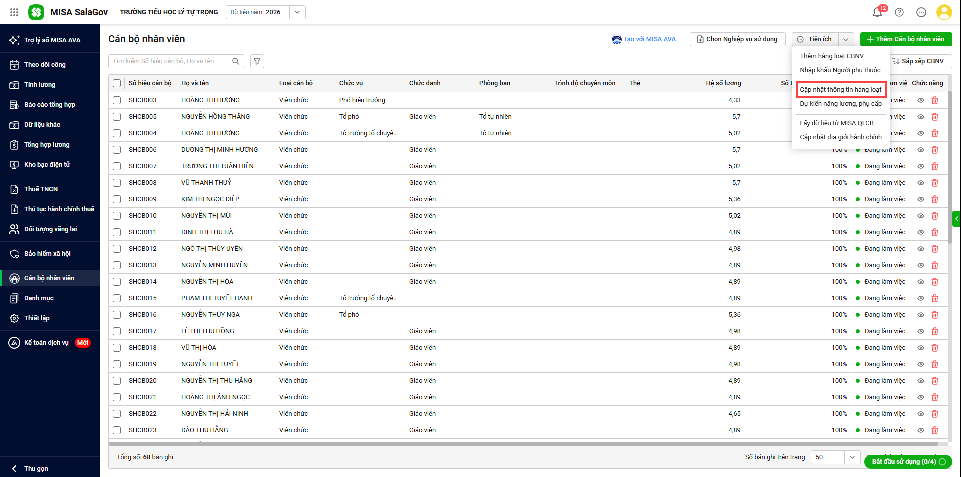- Chọn Tiện ích\Cập nhật thông tin hàng loạt để cập nhật thông tin cho toàn bộ CBNV hoặc tùy chọn CBNV
