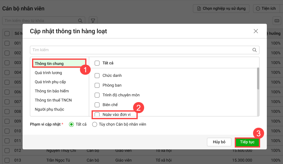 Chọn Phạm vi cập nhật tương ứng, nếu chỉ có 1 vài CBNV được cập nhật thông tin này anh/chị tích chọn Tùy chọn Cán bộ nhân viên và tích chọn CBNV tương ứng