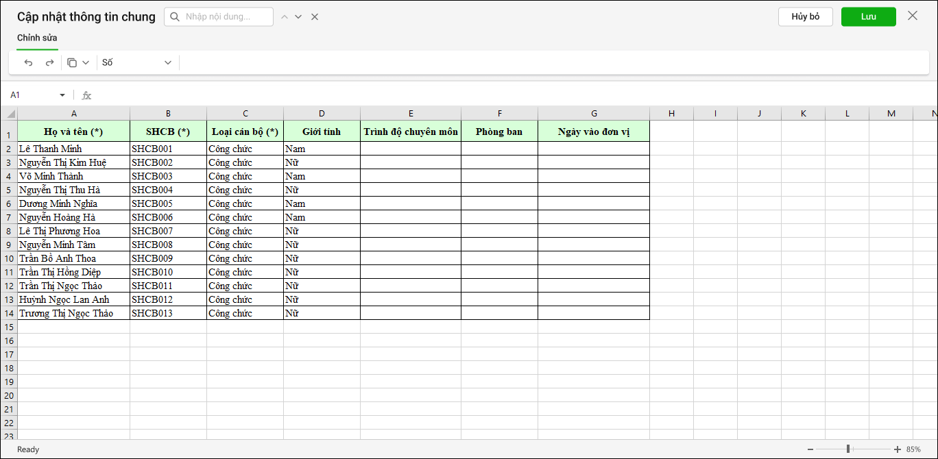 4. Chương trình hiển thị thông tin CBNV đã khai báo trước đó, anh/chị thay đổi thông tin mới cho CBNV tương tự như thao tác trên file excel, sau đó chọn Lưu