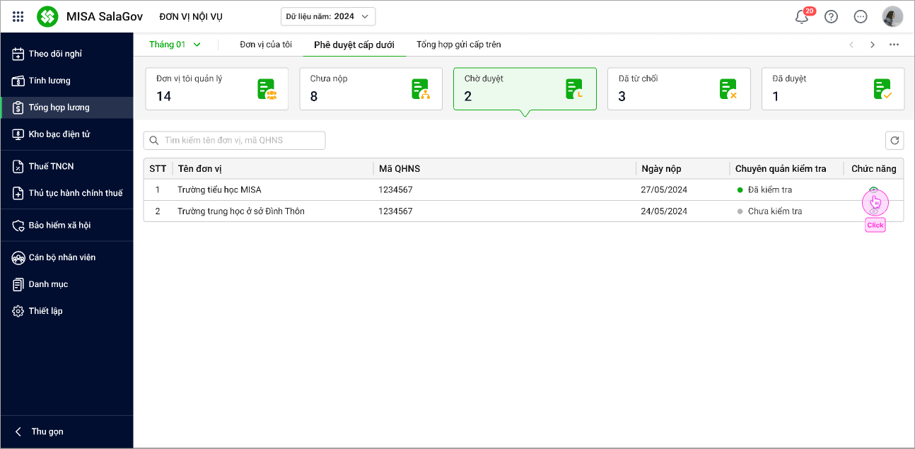 Các đơn vị cấp dưới có thể gộp nhiều bảng lương nhỏ thành một bảng lương hợp nhất và gửi lên cấp trên. Hệ thống hỗ trợ trạng thái “Đã kiểm tra” giúp chủ quản biết ngay đơn vị nào đã được kiểm tra và đơn vị nào còn chờ kiểm tra, hiển thị rõ ràng trên màn hình “Chờ duyệt”. Nếu không có chức năng tự tải lại danh sách, chủ quản rất dễ bỏ sót đơn vị chưa kiểm tra hoặc quên thực hiện kiểm tra đến hết các đơn vị.