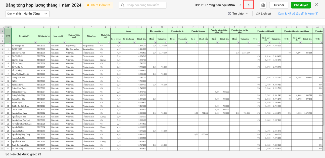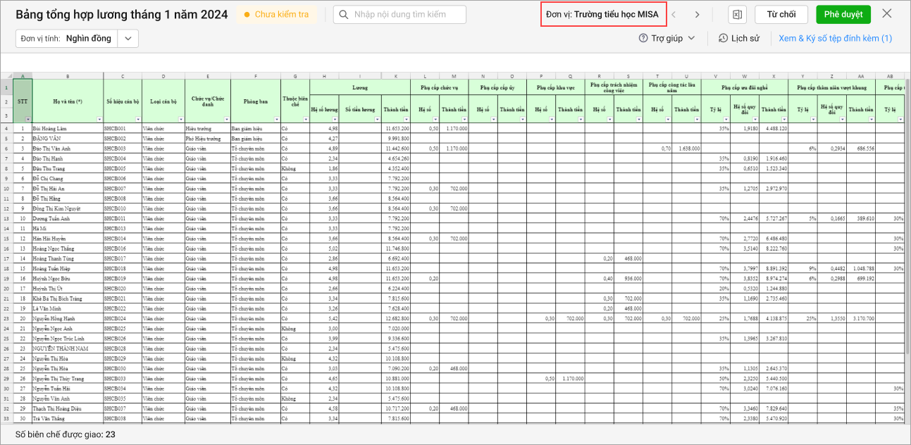 Bảng lương của đơn vị cấp dưới. Khi xem chi tiết bảng tổng hợp lương, hệ thống bổ sung: