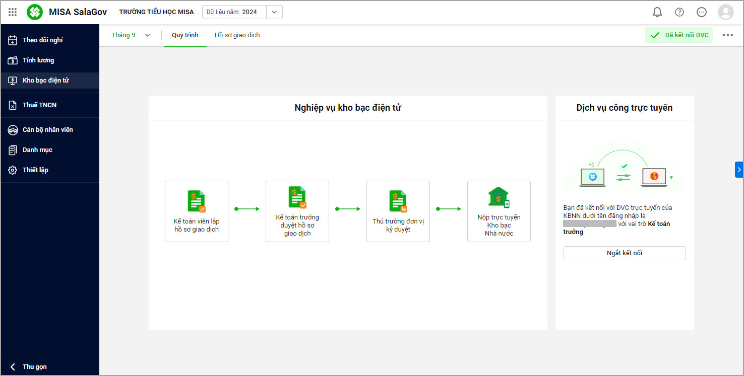 - Khi KBNN phê duyệt sẽ thực hiện mở cổng kết nối với hệ thống kho bạc điện tử của MISA. Khi đó, đơn vị có thể truy cập phần mềm MISA SalaGov và thực hiện kết nối DVC bằng tài khoản đã đăng nhập vào DVC KBNN. Nhập mã Quan hệ ngân sách, Tên đăng nhập và Mật khẩu dựa vào thông tin tài khoản được KBNN cấp, sau đó chọn Đăng nhập