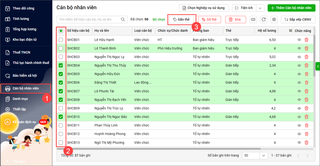 • Tích chọn 1 hoặc nhiều Cán bộ nhân viên. Chọn Gắn thẻ.