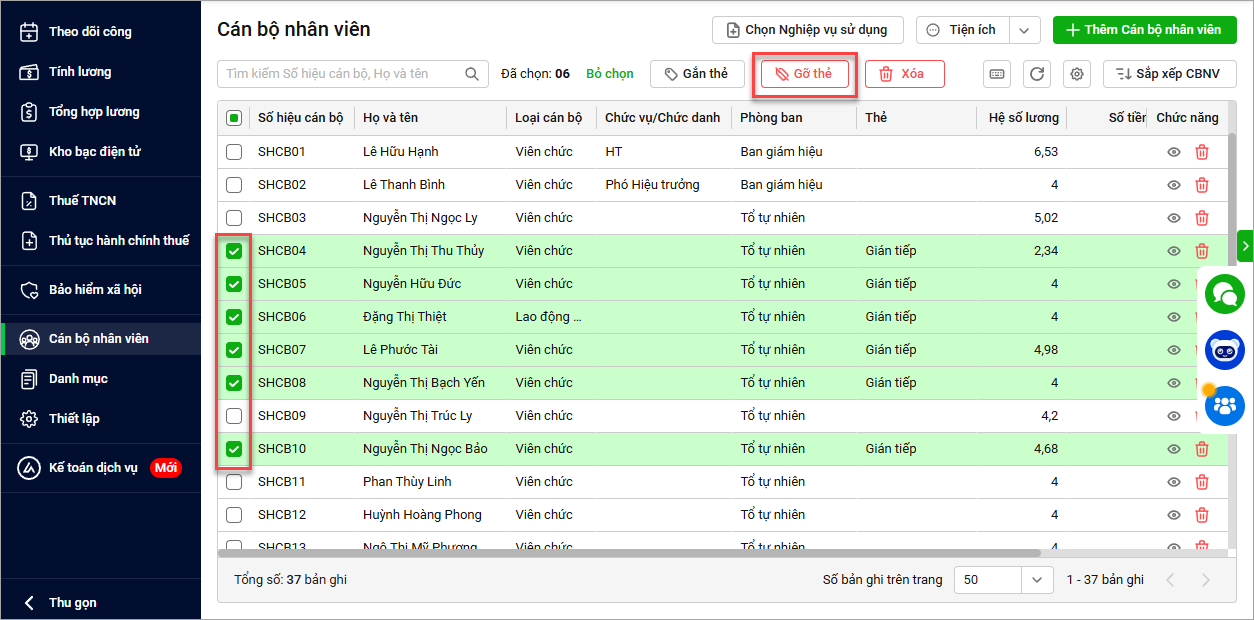 • Trường hợp cần gỡ thẻ, anh/chị tích chọn các CBNV cần gỡ, chọn Gỡ thẻ.