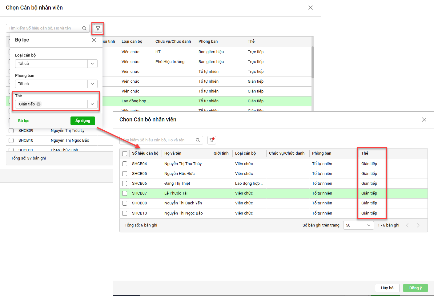 • Sau khi gắn thẻ xong, khi chọn CBNV để lập bảng lương, phụ cấp,… anh/chị có thể sử dụng bộ lọc để lọc nhanh các CBNV theo từng loại thẻ.