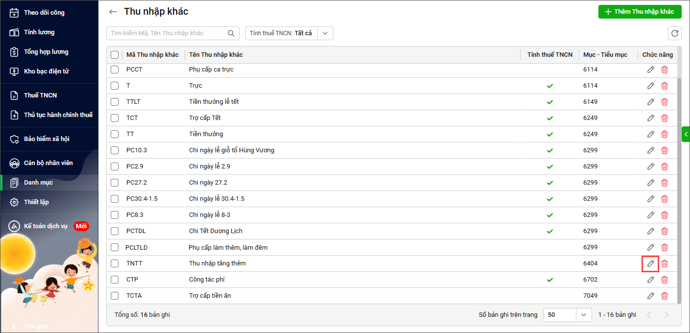 - Nhấn Sửa tại Thu nhập tăng thêm.