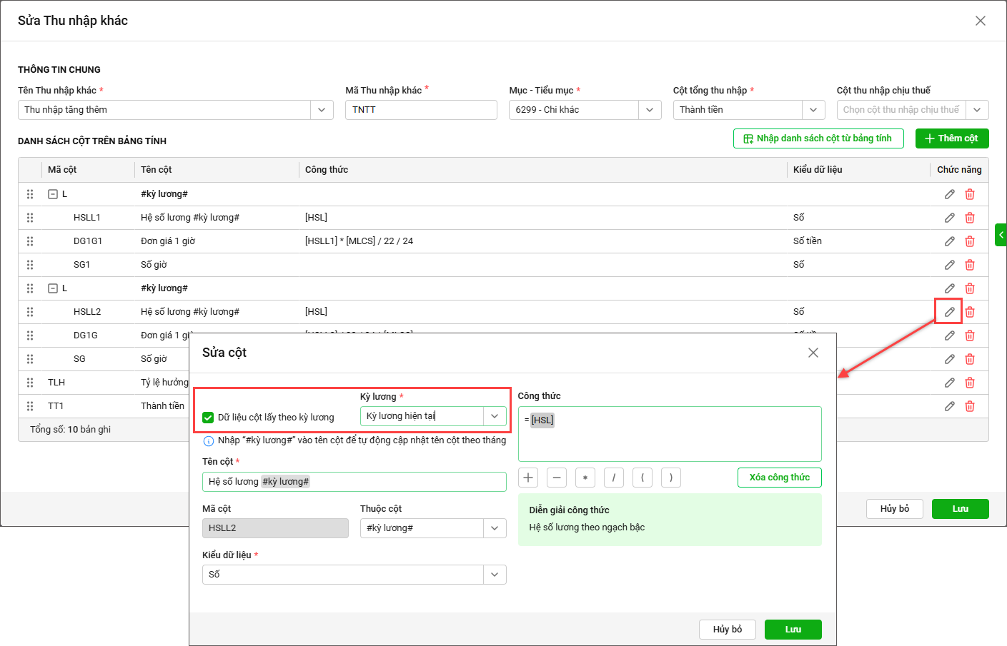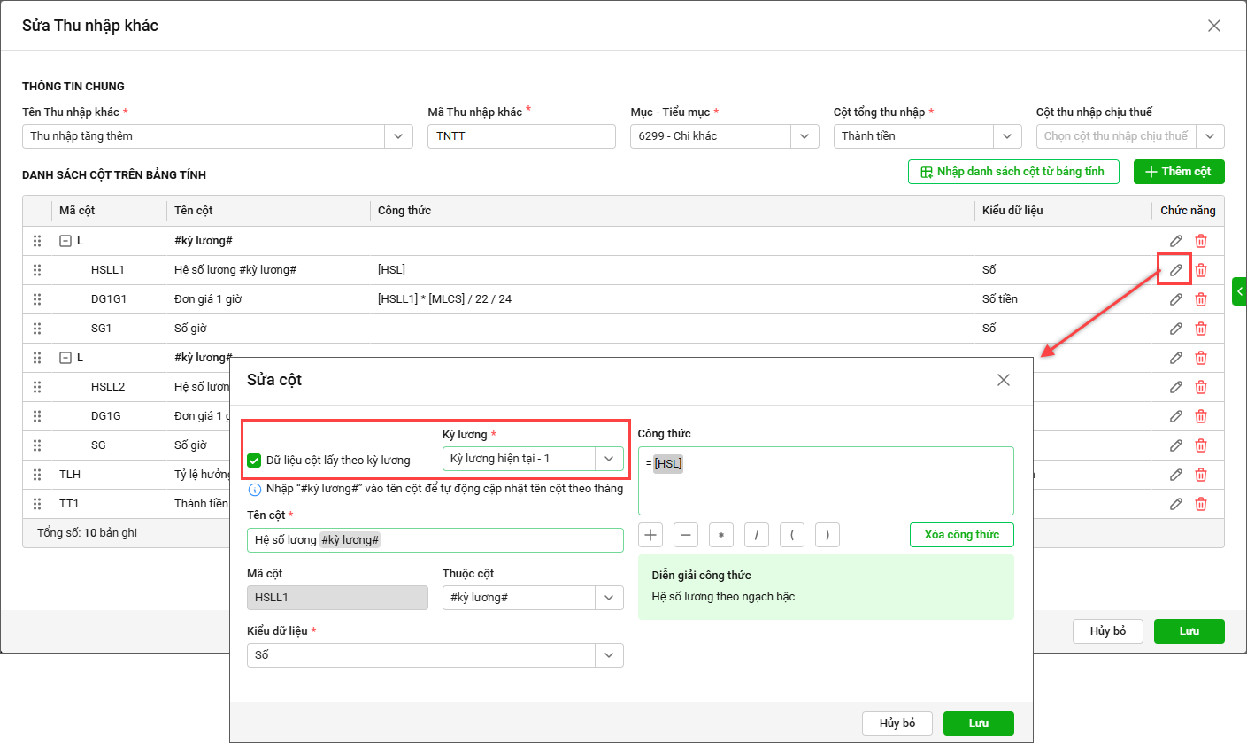 - Thiết lập các cột lấy theo kỳ lương bằng cách nhấn Sửa cột.