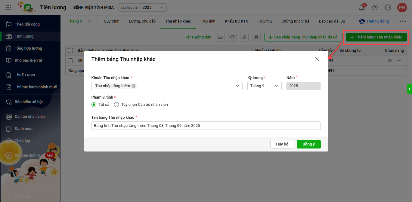 - Nhấn Thêm bảng Thu nhập khác và chọn tham số tương ứng: