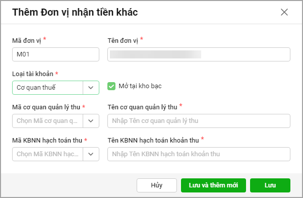 - Chọn Lưu để lưu thông tin đơn vị nhận tiền tại đơn vị hoặc chọn Lưu và thêm mới để lưu và tiến hành thêm mới đơn vị nhận tiền khác.