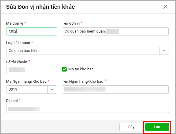 - Chọn Lưu để lưu thông tin đơn vị nhận tiền hoặc Lưu và thêm mới để lưu và tiến hành thêm mới đơn vị nhận tiền khác.