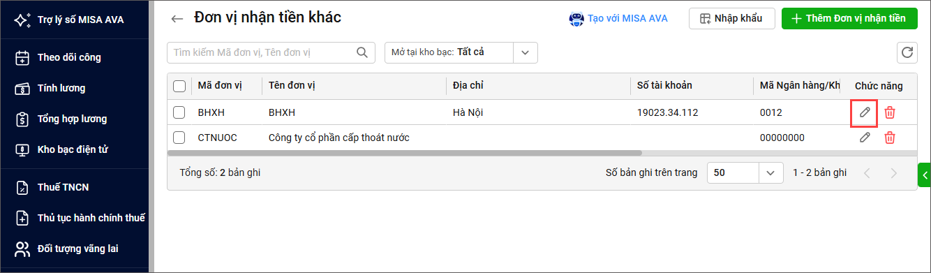 Bước 1: Để sửa thông tin đơn vị nhận tiền, chọn biểu tượng
