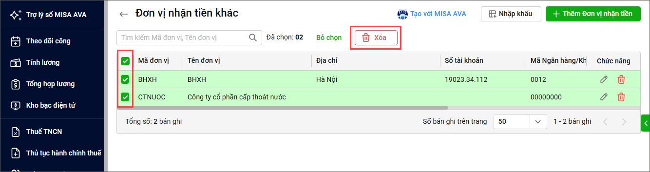 Bước 2: Nếu muốn xóa thông tin đơn vị nhận tiền, tích chọn các danh mục cần xóa và chọn biểu tượng