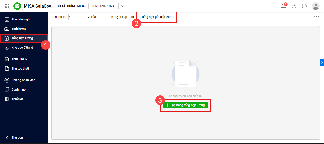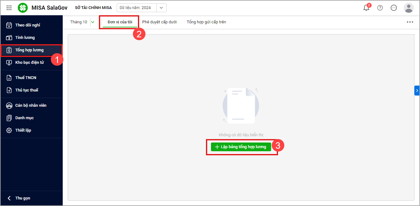 1. Để lập bảng lương tại đơn vị, anh/chị vào menu Tổng hợp lương\Đơn vị của tôi\Lập bảng tổng hợp lương
