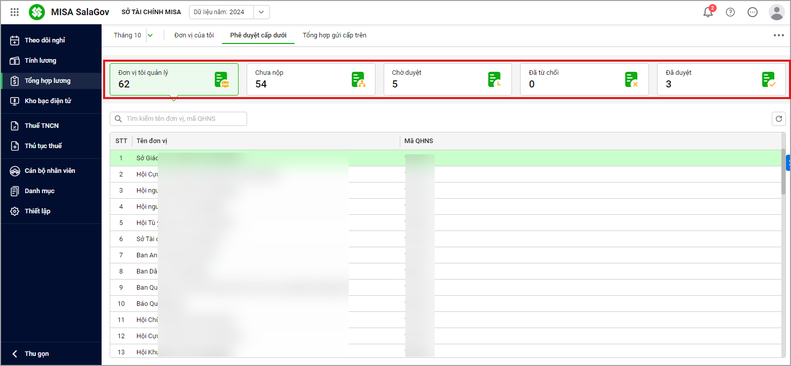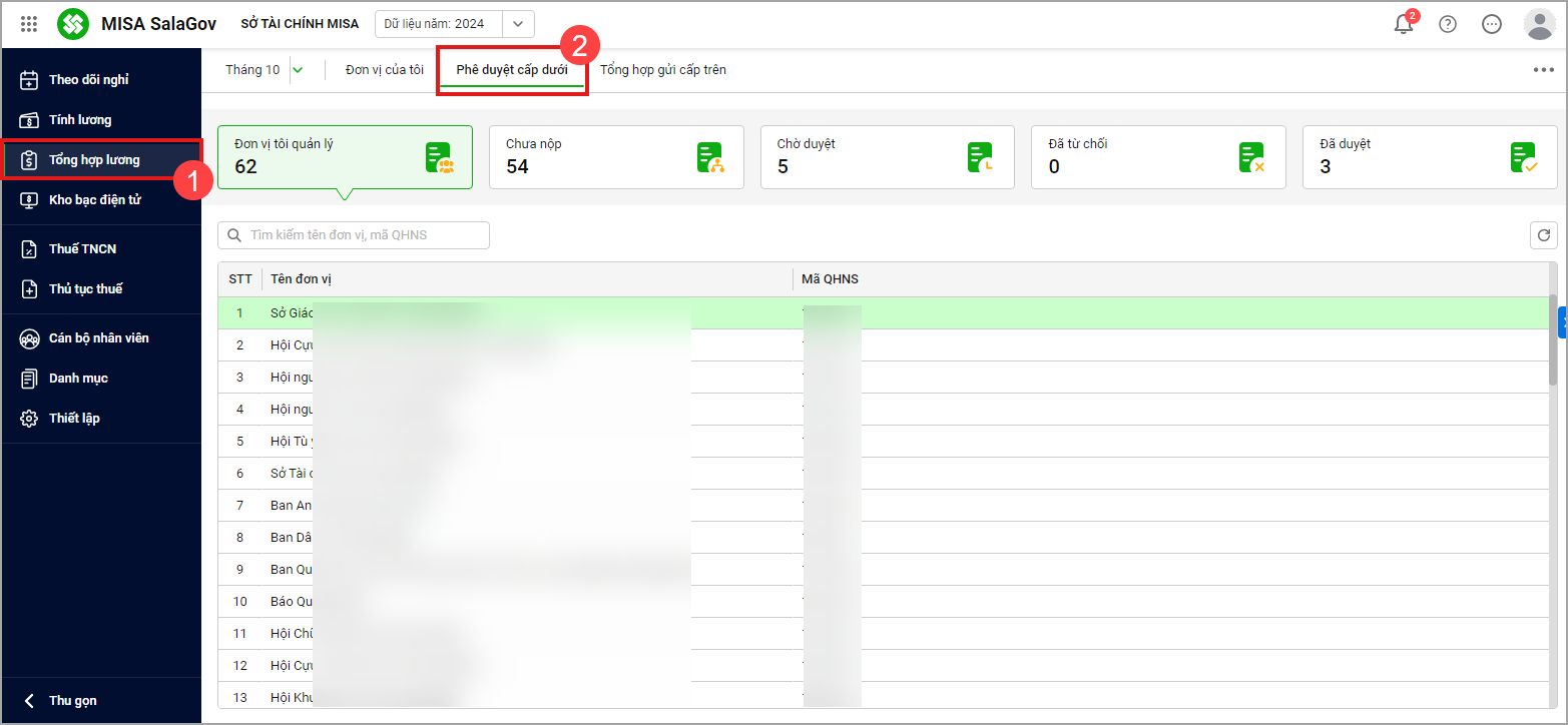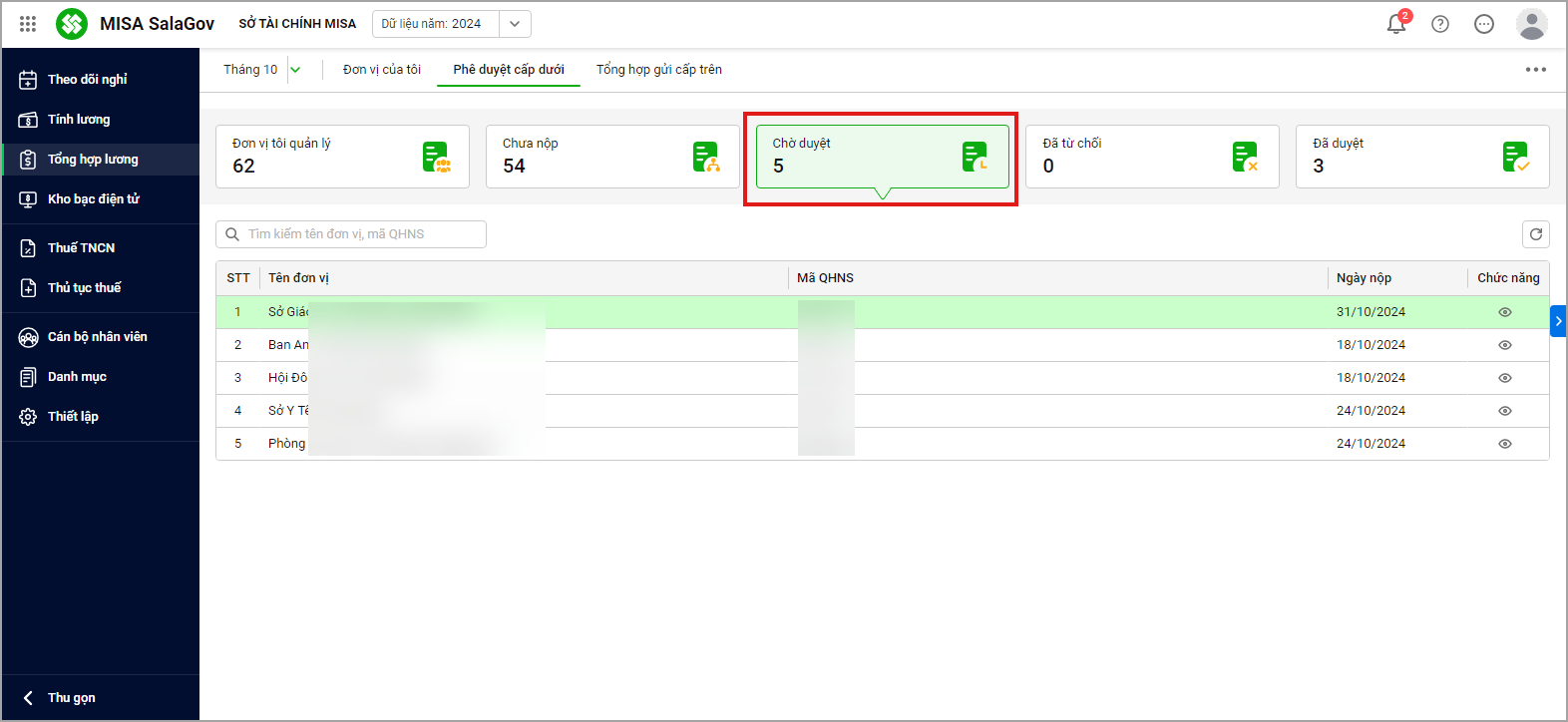 3. Chọn tab Chờ duyệt để duyệt bảng tổng hợp lương của đơn vị cấp dưới