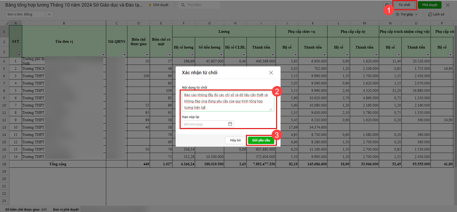 - Nếu bảng tổng hợp lương của đơn vị cấp dưới chưa phù hợp anh/chị chọn Từ chối, nhập nội dung từ chối, chọn ngày nộp lại (nếu có), sau đó chọn Gửi yêu cầu (Đơn vị cấp dưới sẽ nhận được nội dung từ chối và hạn yêu cầu nộp lại)