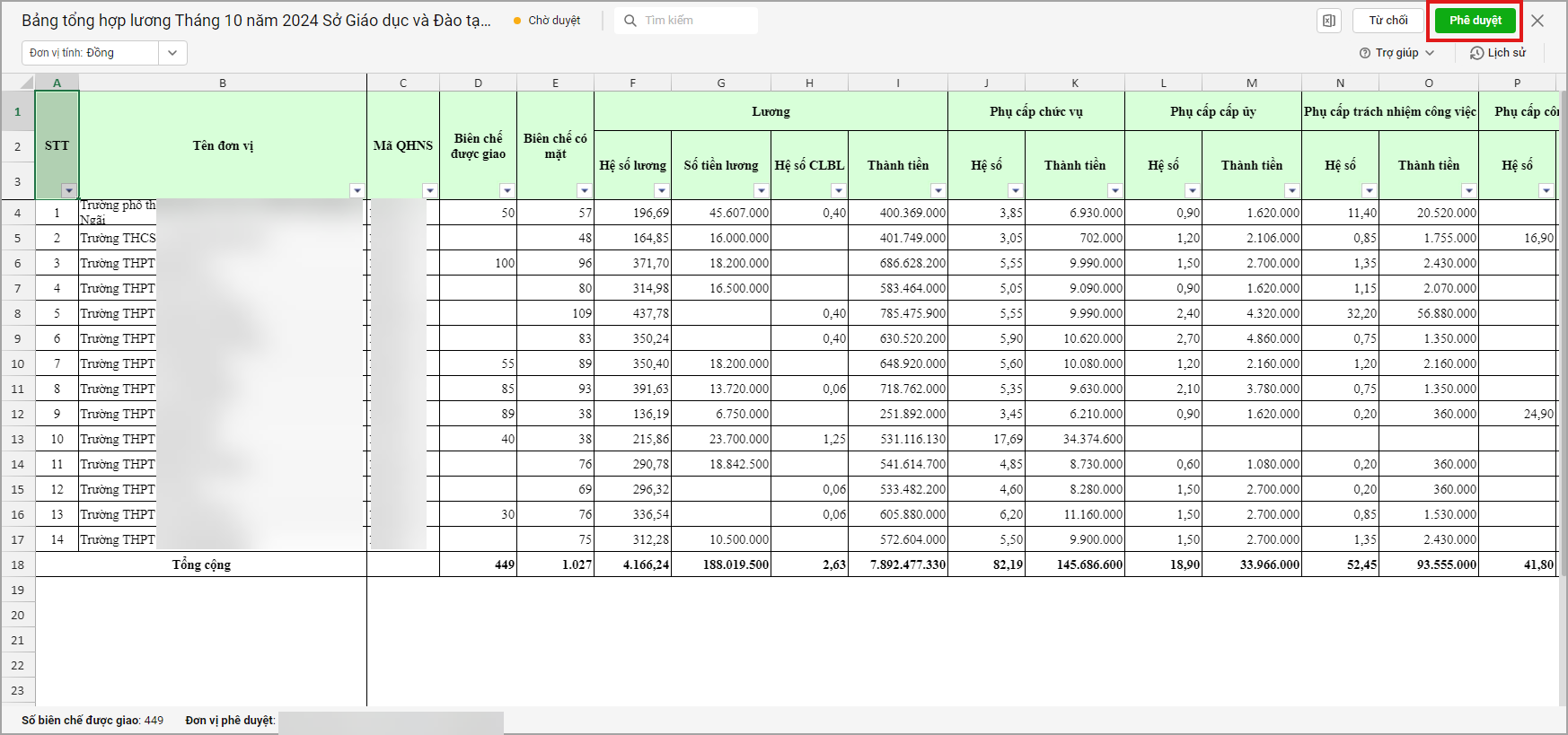 - Bảng tổng hợp lương của đơn vị cấp dưới không có vấn đề gì, anh/chị chọn Phê duyệt (đơn vị cấp dưới cũng sẽ nhận được thông báo bảng tổng hợp lương đã được duyệt)