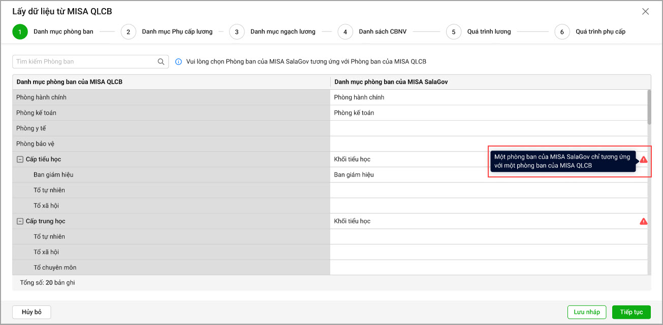 Lưu ý: Nếu anh/chị chọn trùng phòng ban, phần mềm sẽ hiển thị thông báo lỗi. Những phòng ban bị trùng sẽ không được đồng bộ lên MISA SalaGov. Vui lòng kiểm tra và chọn lại phòng ban phù hợp