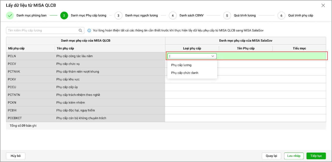 • Danh mục Phụ cấp lương: Phần mềm hiển thị danh mục Phụ cấp lương của QLCB. Anh/chị chọn danh mục Phụ cấp lương của MISA SalaGov tương ứng với MISA QLCB, chọn Tiếp tục. Lưu ý: Nếu anh/chị bỏ trống phụ cấp lương, phần mềm sẽ tự động thêm mới khoản phụ cấp lương đó vào danh mục. Nếu một khoản phụ cấp lương trên MISA SalaGov không được ghép nối với khoản phụ cấp trong phần mềm, khoản phụ cấp đó sẽ bị xóa khỏi danh mục.