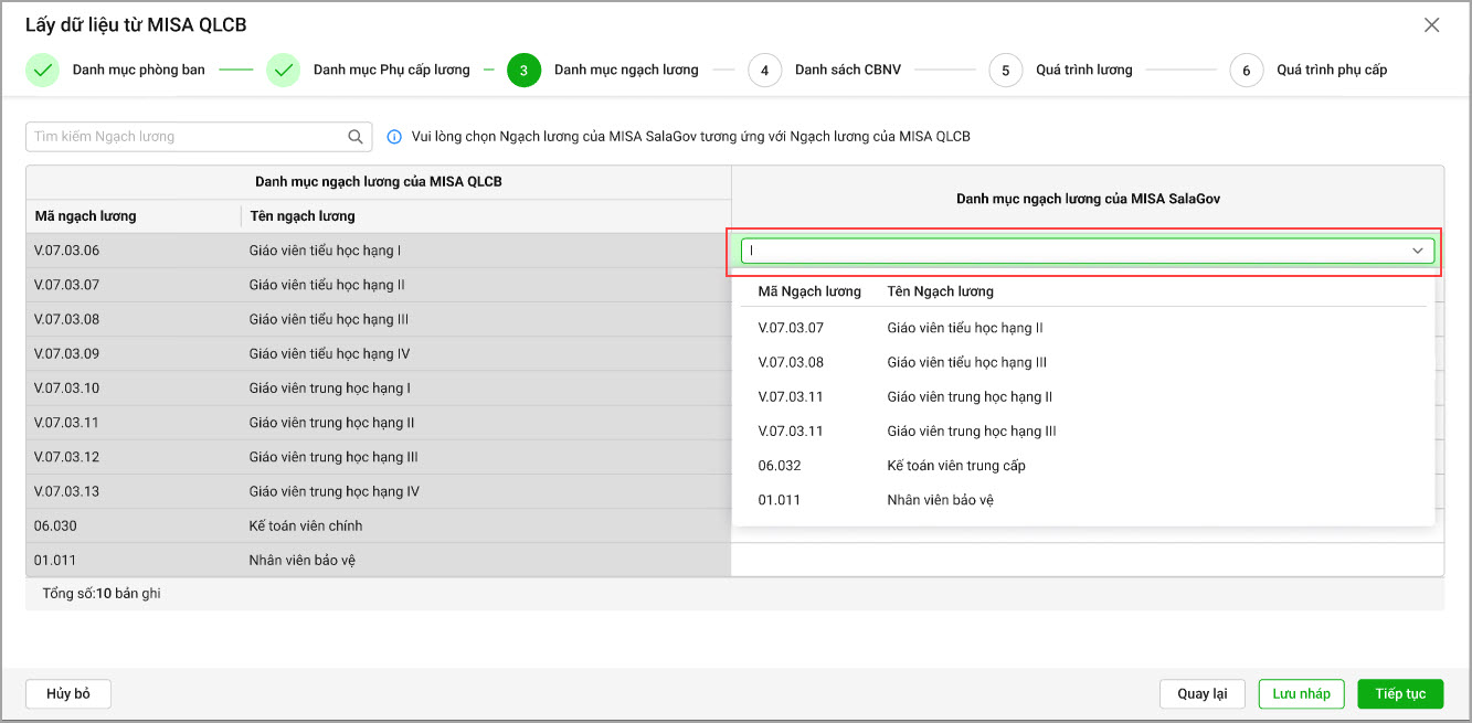 • Danh mục ngạch lương: Phần mềm hiển thị danh mục ngạch lương của QLCB. Anh/chị chọn danh mục ngạch lương của MISA SalaGov tương ứng với MISA QLCB, chọn Tiếp tục. Lưu ý: Nếu anh/chị bỏ trống ngạch lươn, phần mềm sẽ tự động thêm mới khoản ngạch lương đó vào danh mục. Nếu một khoản ngạch lương trên MISA SalaGov không được ghép nối với khoản ngạch lương trong phần mềm, khoản ngạch lương đó sẽ bị xóa khỏi danh mục.