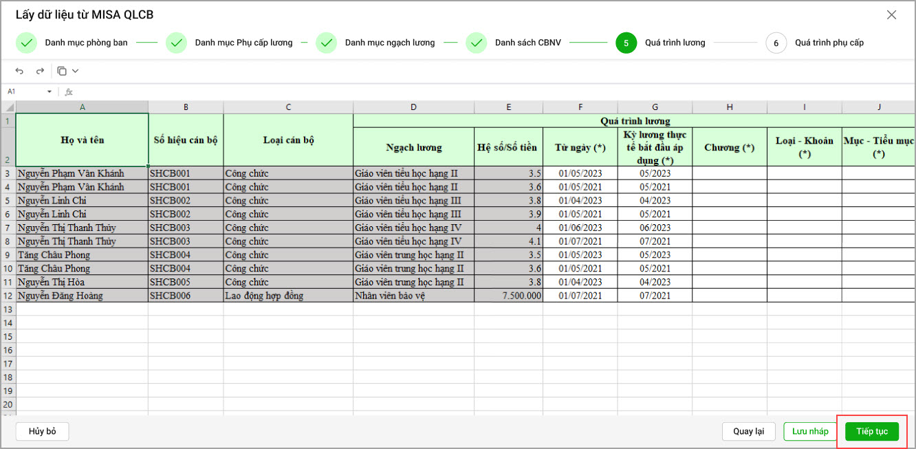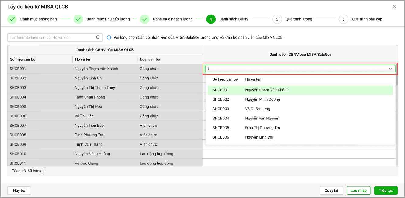 • Danh sách CBNV: Phần mềm hiển thị danh sách CBNV của QLCB. Anh/chị CBNV của MISA SalaGov tương ứng với MISA QLCB, chọn Tiếp tục. Lưu ý: Trường hợp nếu CBNV ở MISA SalaGov không được ghép tuy nhiên đã phát sinh trên các bảng tính thì không được xóa đi