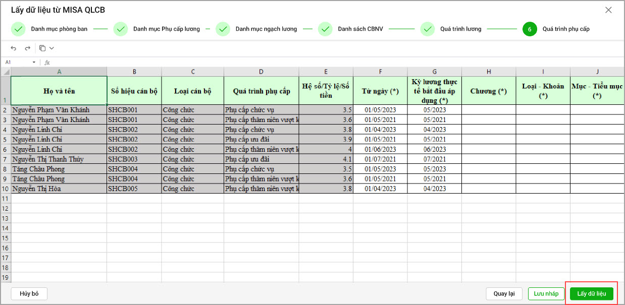 • Quá trình phụ cấp: Phần mềm hiển thị thông tin quá trình phụ cấp của QLCB. Anh/chị kiểm tra thông tin và chọn Lấy dữ liệu.