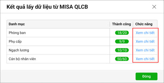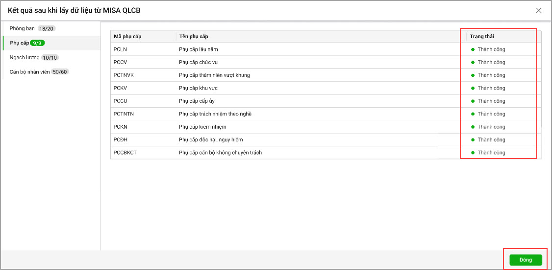 • Với những danh mục có trạng thái là Thành công tức là đã được lấy dữ liệu từ MISA QLCB sang MISA SalaGov thành công, chọn Đóng