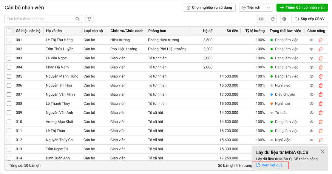 Lưu ý: Khi có bất kỳ thay đổi (thêm, sửa, xóa) thông tin nhân viên trên phần mềm MISA QLCB, phần mềm MISA SalaGov sẽ tự động cập nhật những thay đổi này mà kế toán không cần thao tác thủ công.