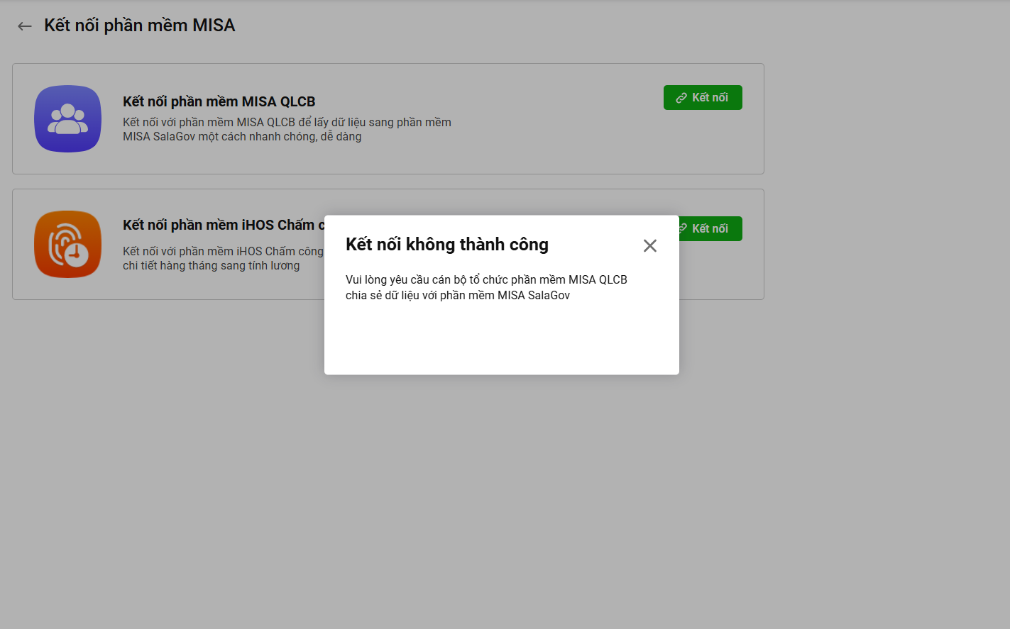 1. Nếu MISA QLCB chưa chia sẻ dữ liệu với MISA SalaGov, khi đồng bộ dữ liệu từ MISA QLCB sẽ hiển thị thông báo như sau: