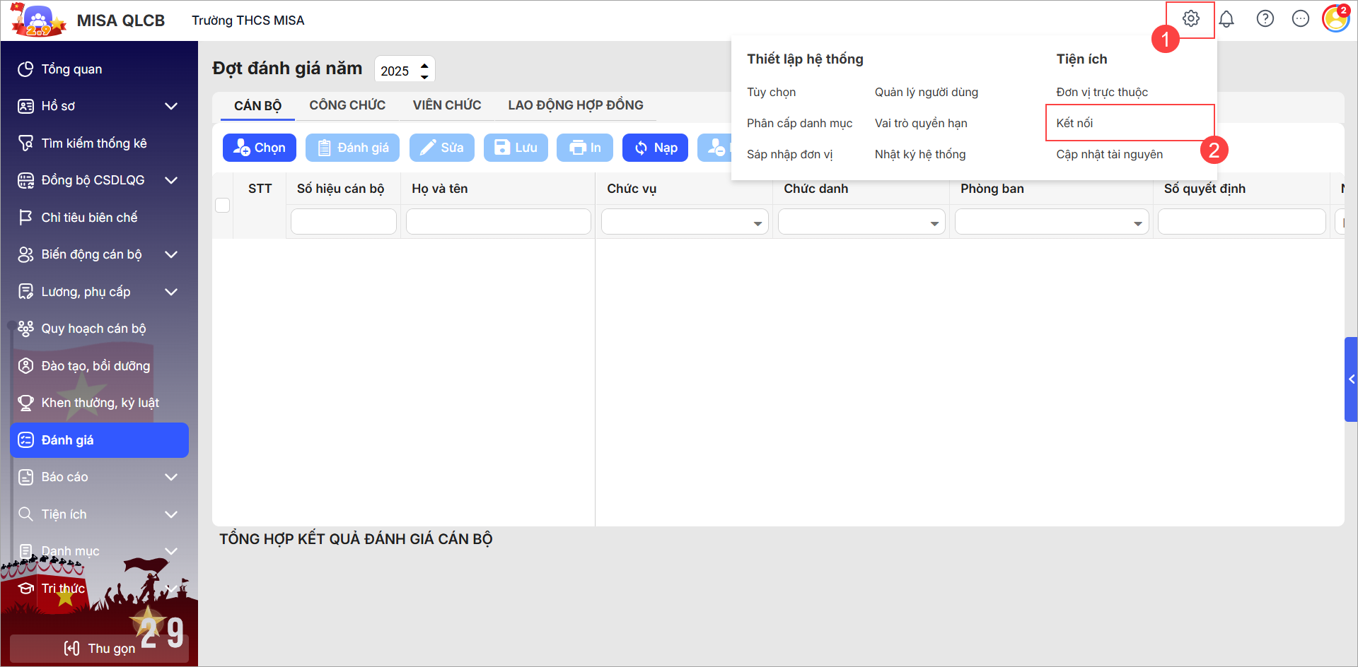 2. Để chia sẻ dữ liệu với MISA SalaGov, anh/chị đăng nhập phần mềm MISA QLCB, chọn biểu tượng cài đặt, chọn Kết nối