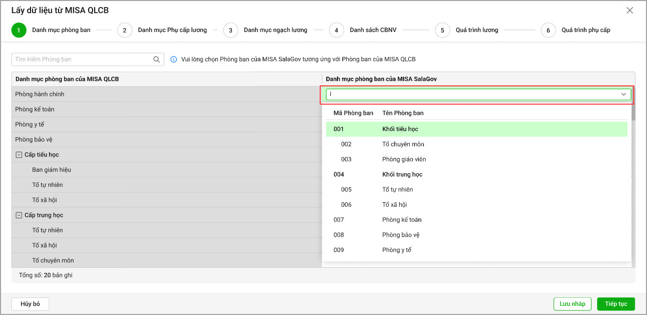 • Danh mục Phòng ban: Phần mềm hiển thị danh mục phòng ban của QLCB. Anh/chị chọn Phòng ban của MISA SalaGov tương ứng với phòng ban của MISA QLCB, chọn Tiếp tục. Lưu ý: Nếu anh/chị bỏ trống phòng ban, phần mềm sẽ tự động thêm mới phòng ban đó vào danh mục. Nếu một phòng ban trên MISA SalaGov không được ghép nối với phòng ban trong phần mềm, phòng ban đó sẽ bị xóa khỏi danh mục.