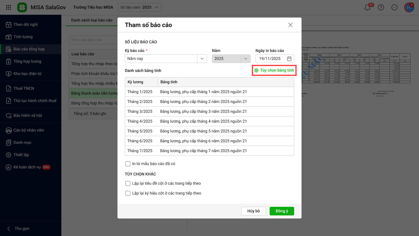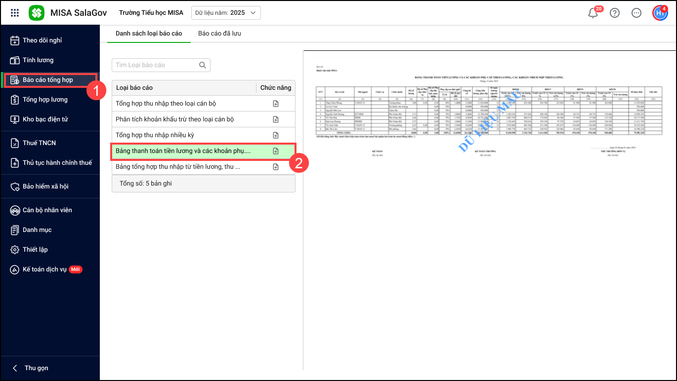 - Vào menu Báo cáo tổng hợp/ Bảng thanh toán tiền lương và các khoản phụ cấp, trích nộp theo lương