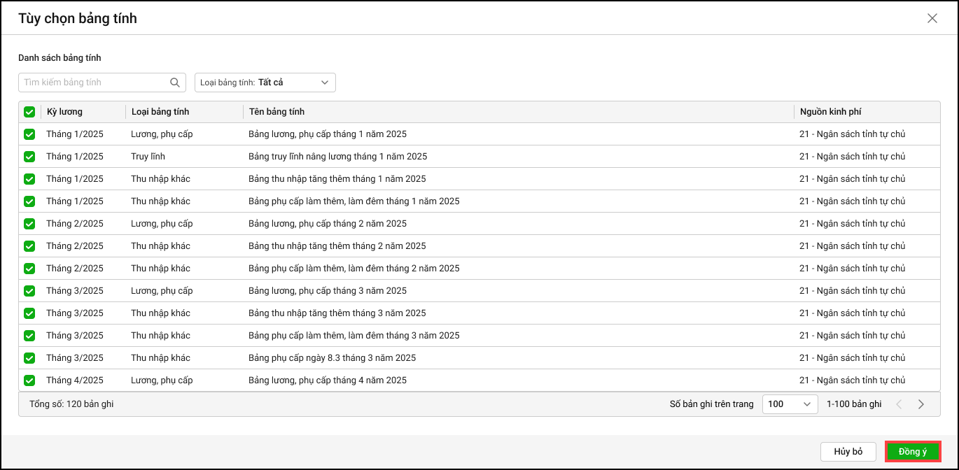 - Tích chọn các bảng tính muốn đưa vào kỳ báo cáo. Nhấn Đồng ý.